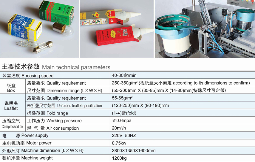 本產品是我公司結合國外裝盒機的先進技術及根據國內制藥行業的實際情況而研發的擁有新型,具有先進的多功能自動裝盒機,是機、電、氣,光一體化的高科技產品,本產品適用于物體小的各類眼藥水瓶、膠水瓶、小燈泡及各類電子、五金等經過震動器加料后自動加入裝盒機輸送帶上進行裝盒或經過震動器加料直接進入盒內進行裝盒。該機還具有自動完成使用說明書的折疊、紙盒自動打開、物品裝盒、打印批號、封盒等功能。該機可以單獨使用亦可以與其他設備聯動使用,形成聯動生產線。