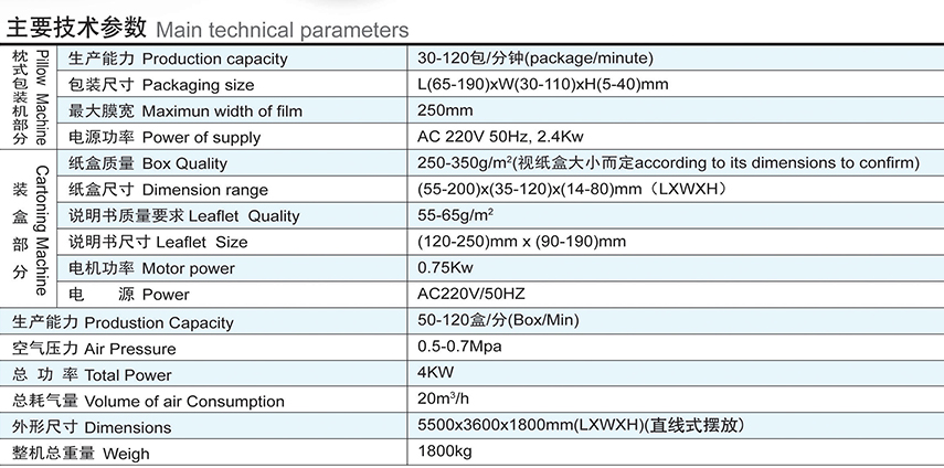 本產品是我公司結合國外生產聯動線的先進技術及根據國內制藥行業的實際情況而研發的擁有新型、具有先進的枕式/裝盒高速生產聯動線,是機、電、氣光-體化的高科技生產線,性能相當穩定、成熟、操作簡單。